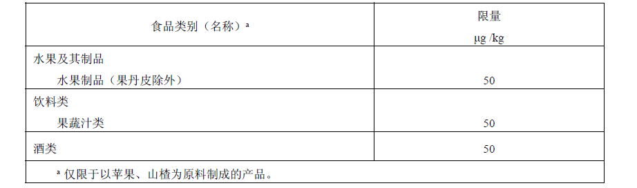 GB2761—2011食品安全國(guó)家標(biāo)準(zhǔn)食品中真菌毒素限量規(guī)定了食品中展青霉素限量指標(biāo)。