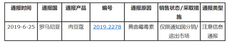 據(jù)歐盟食品和飼料快速預(yù)警系統(tǒng)(RASFF)消息,2019年6月25日,羅馬尼亞通過RASFF通報我國生產(chǎn)的肉豆蔻不合格。