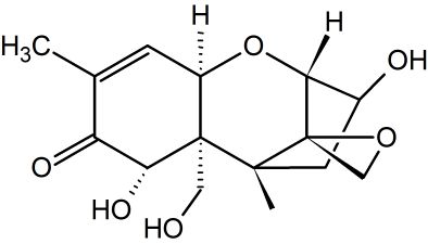 嘔吐毒素主體成分為DON(deoxynivalenol, 脫氧雪腐鐮刀菌烯醇),屬于單端孢霉烯族化合物,主要由禾谷鐮刀菌、尖孢鐮刀菌、串珠鐮刀菌、擬枝孢鐮刀菌、粉紅鐮刀菌、雪腐鐮刀菌等鐮刀菌產(chǎn)生。另外,頭孢菌屬、漆班菌屬、木霉屬等的菌株都可產(chǎn)生該毒素。單端孢霉烯族毒素共有150多種,是一類(lèi)強(qiáng)有力免疫抑制劑,所引起典型癥狀是采食量降低,所以這類(lèi)毒素又叫飼料拒食毒素。嘔吐毒素(DON)是其中最重要一種毒素,主要來(lái)自鐮刀菌屬(Fusarium),尤其是禾谷鐮刀菌(Fusariumgraminearum)和黃色鐮刀菌(Fusarium culmorum)。由于它可以引起豬的嘔吐,故又名嘔吐毒素(vomitoxin,VT)。由于它可以引起豬的嘔吐而得名,對(duì)人體有一定危害作用,歐盟分類(lèi)標(biāo)準(zhǔn)為三級(jí)致癌物。