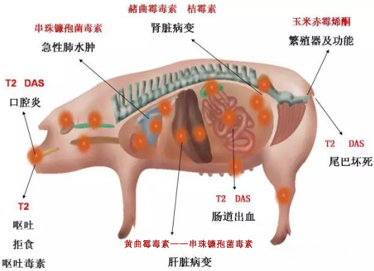 今年自入秋以來,尤其華北地區(qū),接連不斷的降雨,將嚴(yán)重影響今年的秋收和秋種,玉米作為主產(chǎn)區(qū)之一,對于其收獲和晾曬收藏嚴(yán)重受到影響,玉米質(zhì)量也隨之下降,嚴(yán)重營養(yǎng)著養(yǎng)殖企業(yè)的飼料安全情況。其次長期的潮濕會對養(yǎng)殖行業(yè)的環(huán)境、飼料帶來受潮、發(fā)霉的危害。說起霉菌毒素首先想到玉米,其次還有豆粕、麩皮、小麥、魚粉等原料在一定條件下均可產(chǎn)生霉菌毒素。霉菌毒素對養(yǎng)豬行業(yè)造成的危害是十分巨大的,一旦豬群收到了霉菌毒素的污染,那么各種疾病的發(fā)病率就會節(jié)節(jié)攀升,像我們已知的藍(lán)耳病、 圓環(huán)病毒、偽狂犬病、豬瘟、衣原體病、弓紅蟲病等經(jīng)常困擾。同時還會破壞豬的機(jī)體器官,造成腸道受損,肝臟損壞等疾病, 而且同時母豬的生產(chǎn)能力也會下降、幼崽發(fā)病率提高,采食量下降或者拒食,導(dǎo)致豬群生長緩慢,飼料報(bào)酬降低,瘦肉率也大大降低。 豬群免疫力直線下降:疫苗的保護(hù)力大大降低,豬群交叉感染及其嚴(yán)重,藥物治療效果差,豬群的死亡率大大增加。