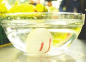 1.2:加入200ml純凈水,將雞蛋放入溶液中,懸?。ú荒芟鲁粒┑牡盀殛惻f或腐壞蛋(試劑可重復(fù)使用,用完后蓋上蓋子放于通風(fēng)干燥處即可)。