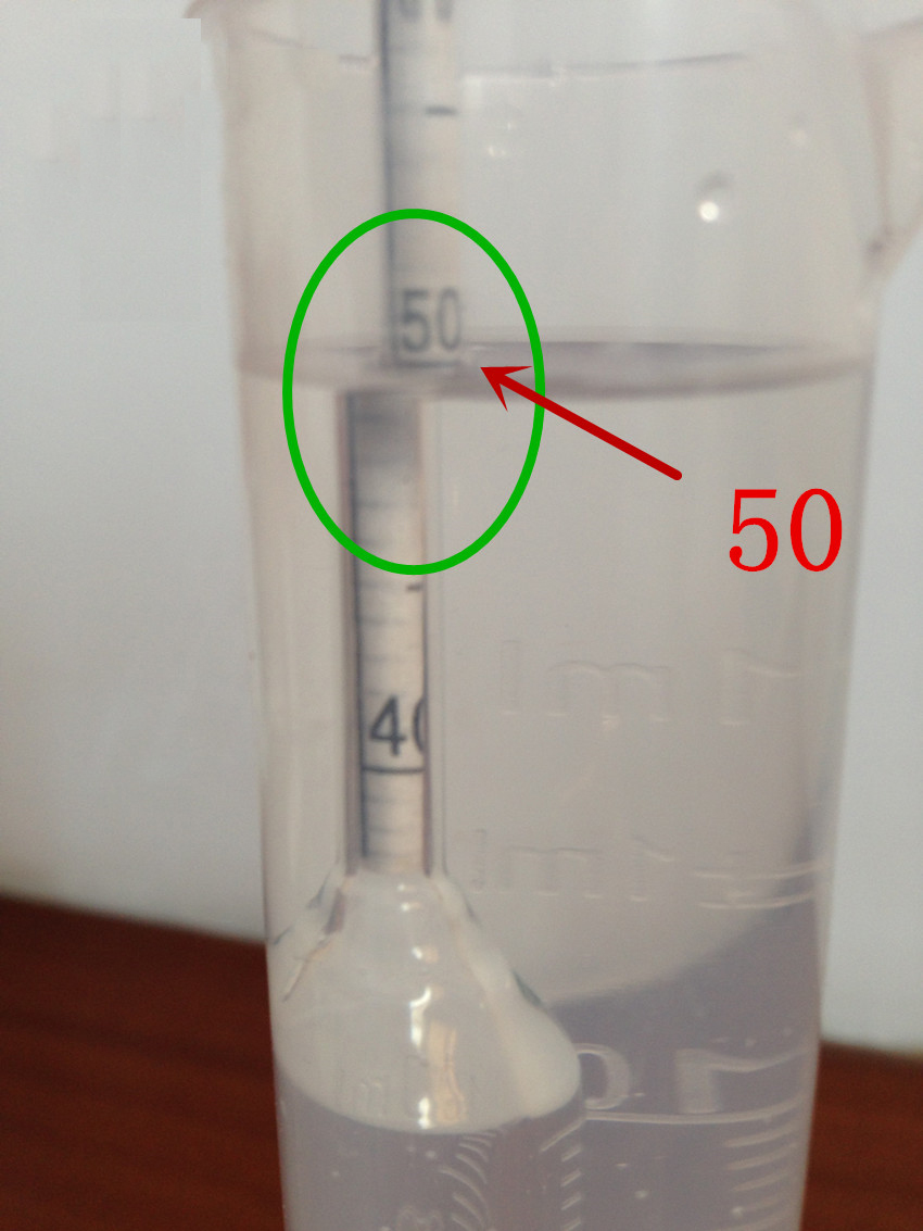 1.3:讀數(shù)按彎月面下緣讀數(shù),觀察者的眼睛應(yīng)稍低于液面,使看到的液面成橢圓形,然后慢慢抬高眼睛位置直至橢圓形變成一條直線(xiàn)為止,讀出此直線(xiàn)的分度表上的位置(下右圖為50);
