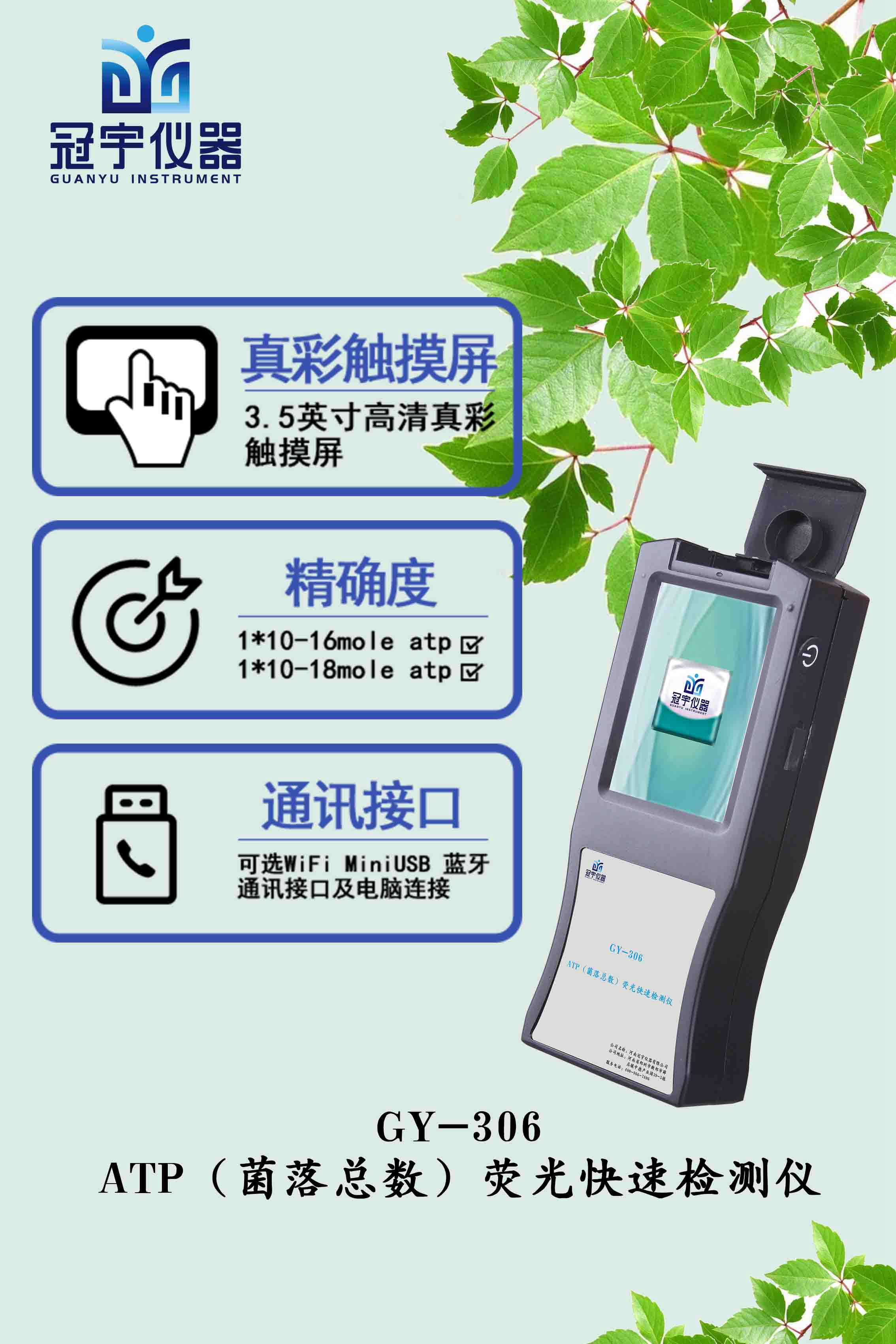 ATP熒光檢測(cè)儀GY-306ATP熒光快速檢測(cè)儀是河南冠宇儀器有限公司基于螢火蟲(chóng)發(fā)光原理,利用“熒光素酶—熒光素體系”研制而成;ATP(Adenosine Triphosphate)中文名字是三磷酸腺苷。ATP是已知的各種生命活動(dòng)能量的直接來(lái)源,因?yàn)樵诘厍蛏系膭?dòng)植物細(xì)胞、細(xì)菌和食物殘?jiān)兄灰猩牡胤蕉己蠥TP即三磷酸腺苷。由于所有生物活細(xì)胞中含有恒量的ATP,所以ATP含量可以清晰地表明樣品中微生物與其他生物殘余的多少,ATP熒光檢測(cè)儀適用于食品、飲用水中微生物快速檢測(cè),餐具潔凈度快速檢測(cè),食品加工器具、工作臺(tái)面、餐飲器具等消毒結(jié)果快速檢測(cè),醫(yī)療環(huán)境工作平臺(tái)即時(shí)評(píng)估。
