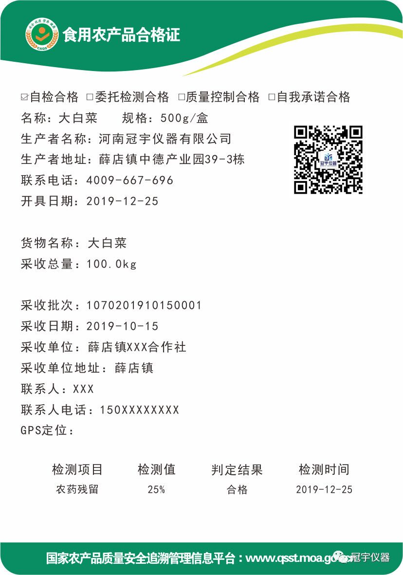 河南冠宇儀器有限公司可為各農(nóng)業(yè)合作社建立二維碼追溯平臺,實(shí)現(xiàn)數(shù)據(jù)溯源和企業(yè)形象宣傳。目前冠宇儀器研發(fā)的食用農(nóng)產(chǎn)品合格證農(nóng)藥殘留檢測一體機(jī)GY-NC24A已正式進(jìn)入市場,對全面推廣食用農(nóng)產(chǎn)品合格證打印農(nóng)藥殘留快速檢測制度將起到積極的作用。