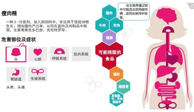 人食用含殘留鹽酸克倫特羅豬肉后對(duì)肝、腎等內(nèi)臟器官會(huì)產(chǎn)生毒害作用,出現(xiàn)心悸、頭痛、目眩、惡心、嘔吐、心率加快、肌肉振顫等癥狀,特別是對(duì)高血壓、心臟病、甲亢和前列腺肥大等疾病患者危害更大,嚴(yán)重的可導(dǎo)致死亡。