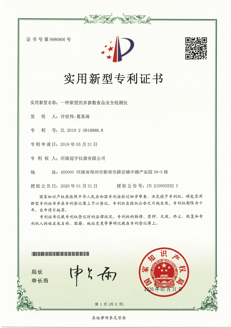 近日,河南冠宇儀器有限公司(以下簡稱:冠宇儀器)繼之前的多項軟件著作權證書及專利證書之后,又獲由中華人民共和國國家版權局頒發(fā)的一項“一種新型的多參數(shù)食品安全檢測儀實用新型專利證書”,一系列的權威肯定,彰顯了冠宇儀器強大的技術研發(fā)能力,也體現(xiàn)出公司為客戶提供優(yōu)質產(chǎn)品的強大決心。