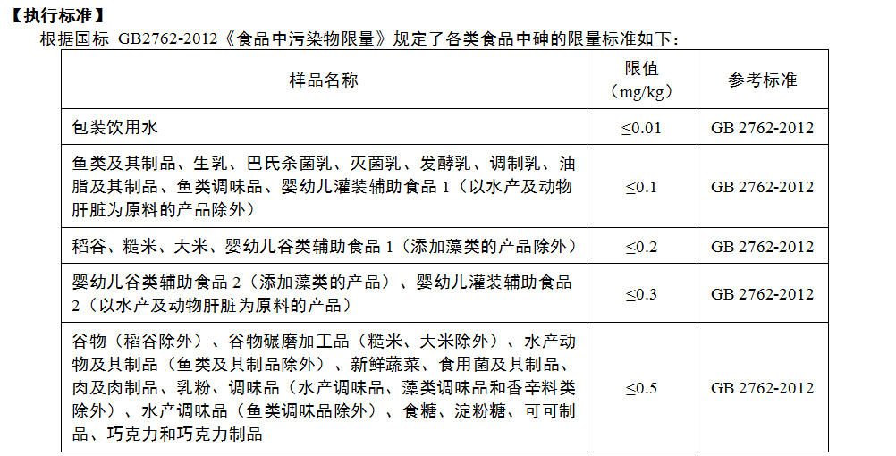 我國《食品安全國家標(biāo)準(zhǔn) 食品中污染物限量》(GB 2762-2012)中對谷物及其谷物碾磨加工品、糙米及大米、嬰幼兒谷物輔助食品(添加藻類的除外)、添加藻類的嬰幼兒谷物輔助食品等食品中的無機(jī)砷限量均做了明確要求,只要相關(guān)產(chǎn)品符合國家標(biāo)準(zhǔn),對人體健康就不會(huì)造成產(chǎn)生危害。