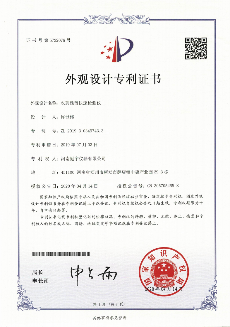 近日,河南冠宇儀器有限公司(以下簡(jiǎn)稱:冠宇儀器)繼之前的多項(xiàng)軟件著作權(quán)證書(shū)及專利證書(shū)之后,又獲由國(guó)家知識(shí)產(chǎn)權(quán)局頒發(fā)的一項(xiàng)“農(nóng)藥殘留快速檢測(cè)儀外觀設(shè)計(jì)專利證書(shū)”,一系列的權(quán)威肯定,彰顯了冠宇儀器強(qiáng)大的技術(shù)研發(fā)能力,也體現(xiàn)出公司為客戶提供優(yōu)質(zhì)產(chǎn)品的強(qiáng)大決心。
