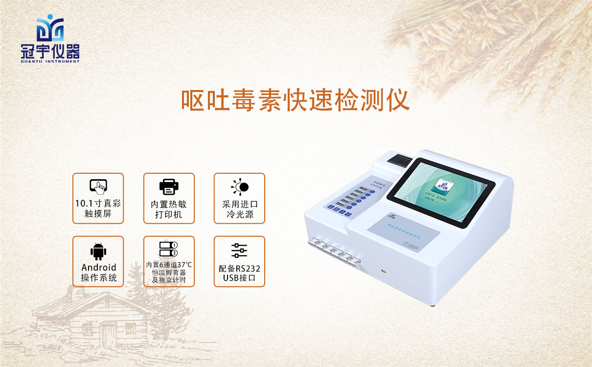 冠宇儀器嘔吐毒素快速測試儀GY-710應用競爭抑制免疫層析的原理,通過檢測線熒光定量卡中的熒光強弱程度,定量分析待檢樣品中嘔吐毒素殘留含量;嘔吐毒素檢測儀,嘔吐毒素快速檢測儀,嘔吐毒素快速測試儀能夠快速檢測玉米、小麥、大米、大麥、小米和燕麥等谷物、飼料、面粉、食用油、調(diào)味品等食品中嘔吐毒素含量,適用于糧油監(jiān)測中心、糧油飼料生產(chǎn)加工、食品加工貿(mào)易、畜禽養(yǎng)殖戶自查、工商質監(jiān)部門用于市場快速篩查等
