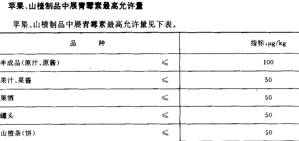 以下是蘋果、山植制品中展青霉素最高允許量見下表: