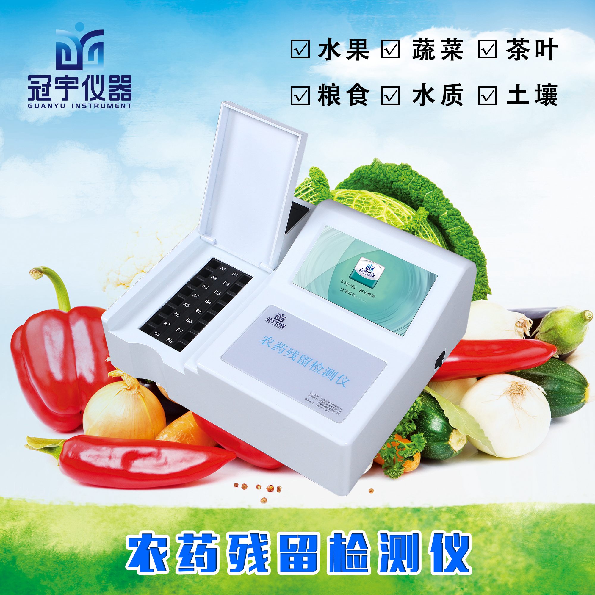 針對農(nóng)藥殘留是否超標(biāo)這一問題,河南冠宇儀器研制出一款通用廣泛性好的農(nóng)藥殘留檢測儀,可以有效地對蔬菜中有機(jī)磷和氨基甲酸酯這兩大類農(nóng)藥殘留進(jìn)行快速檢測。滿足多品種、多場合、多地域使用,也可廣泛應(yīng)用于各級政府蔬菜檢測中心、農(nóng)貿(mào)市場、超市、環(huán)保機(jī)構(gòu)、蔬菜種植基地、飯店、車載及實驗室等食品安全檢測與監(jiān)控場所等單位。