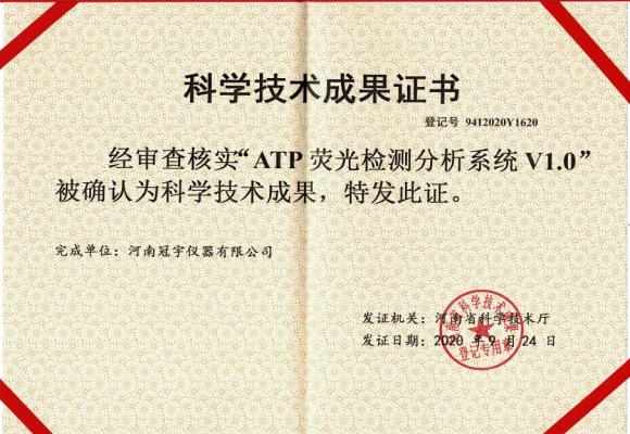 河南冠宇儀器有限公司(以下簡稱:冠宇儀器)繼多項(xiàng)軟件著作權(quán)證書、實(shí)用新型專利證書、計(jì)算機(jī)軟件著作權(quán)等一系列證書之后,又獲由河南省科學(xué)技術(shù)廳頒發(fā)的一項(xiàng)“ATP熒光檢測(cè)分析系統(tǒng)V1.0科學(xué)技術(shù)成果證書”,一系列的權(quán)威肯定,彰顯了冠宇儀器強(qiáng)大的技術(shù)研發(fā)能力,也體現(xiàn)出公司為客戶提供優(yōu)質(zhì)產(chǎn)品的強(qiáng)大決心。