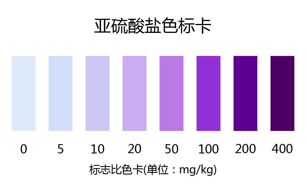 2.1:2分鐘后觀察檢測(cè)管中顏色的深淺,紫紅色顏色越深,表示樣品中亞硫酸鹽的含量越高。